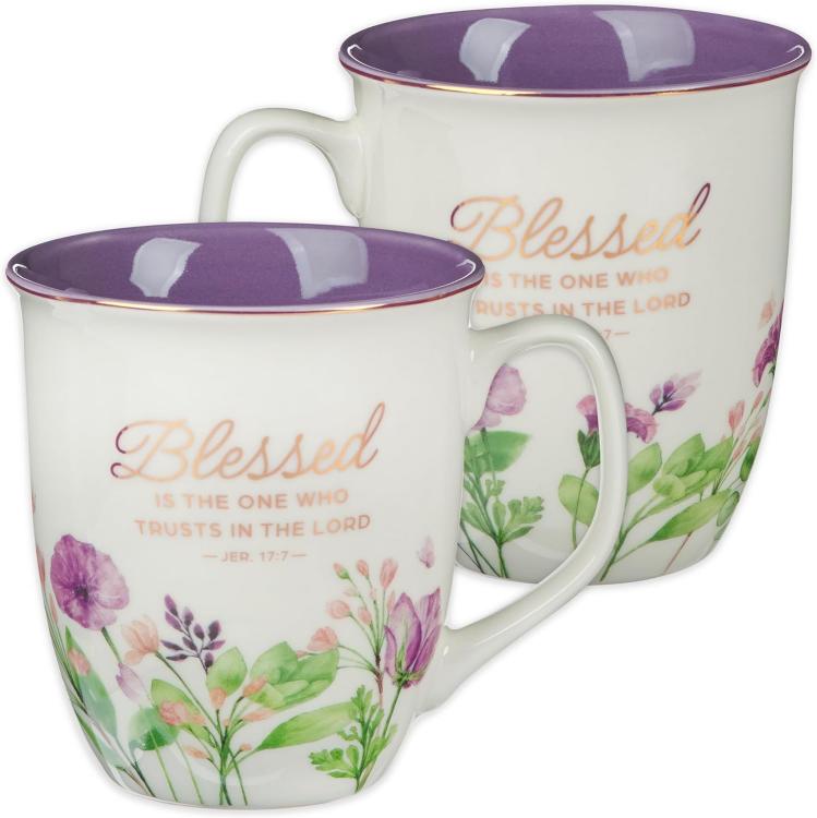 The Blessed is the One Purple Meadow Ceramic Coffee Mug is part of the New Mercies Purple Meadow Collection, designed by Rebecca Canale. This collection celebrates the great mercy of God and includes a magnetic bookmark set, a ceramic teapot, a compact mirror, a ceramic coffee mug, a notebook set, a faux leather Bible case, and a wirebound journal.