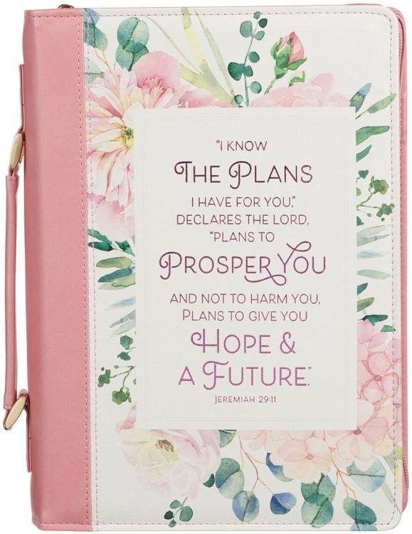 The Plans Pink Bouquet Faux Leather Fashion Bible Cover combines protection and a stylish reminder of God’s guidance to ensure your Bible remains in excellent condition with daily use.