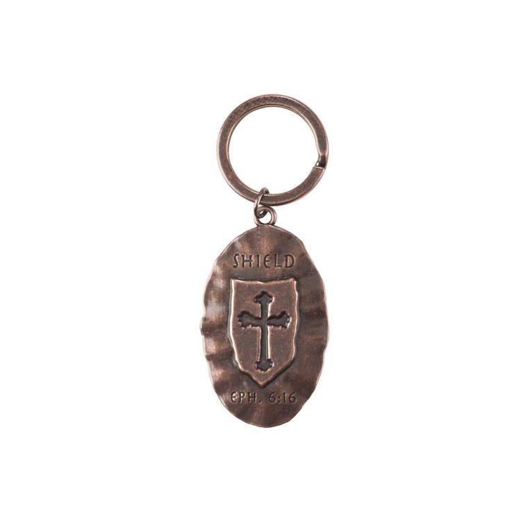 Full Armor of God Shield of Faith Copper Finish Keyring Attractive metal keyring tag features a copper tone finish and hammered texture. One side is engraved with “”Put on the full armor of God -The Shield of Faith.”” The other has an ancient shield design, with the word Shield engraved above and the verse reference Eph. 6:16 engraved below. Tag is 2″” high.