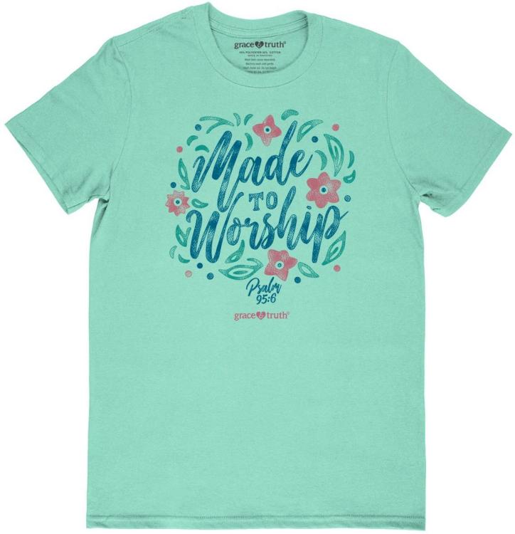 Give glory to God in this artsy Made To Worship grace & truth T-Shirt in Mint Green. As believers, we are called to praise the name of the Lord at all times, in all circumstances, because He is worthy to be praised.
