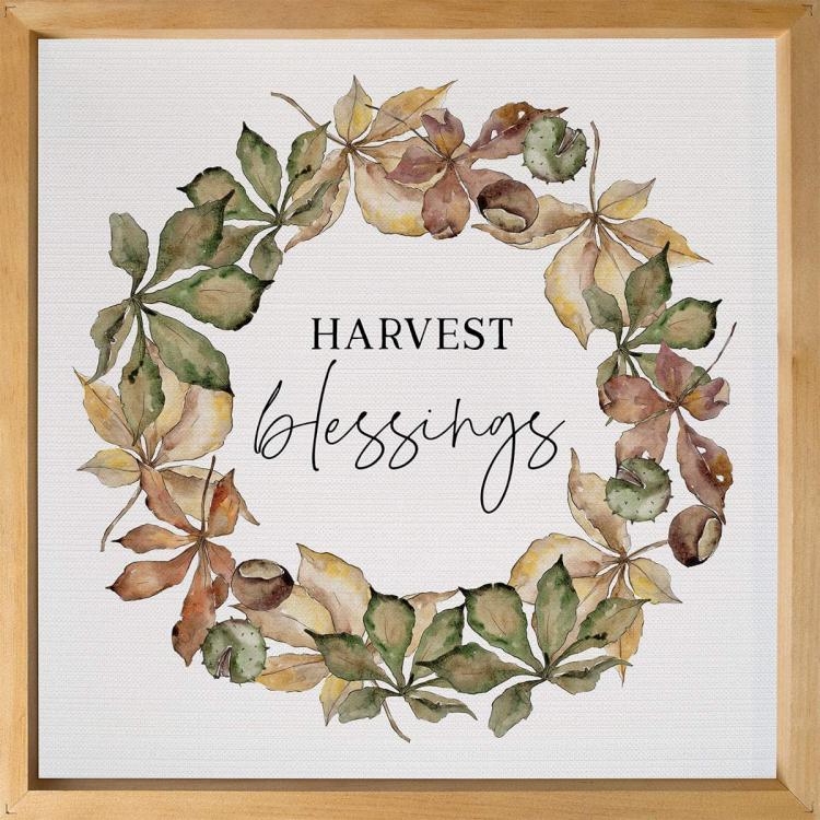 Harvest Blessings Framed Textured Sign features sentiment “Harvest Blessings”; Texture adds depth and light shadowing. Sign is made of solid wood with natural brown finish; Uniquely crafted and includes a soft, textured backing overlaid with elegant design and sentiment. Decorative sign measures approximately 20.775 x 20.775 x 2 inches; Deep frame allows for wall hanging or tabletop display. Perfect for display on a tabletop or as part of a shelf arrangement. Proudly made in the USA, in the heart of Amish country; Ships in protective packaging.