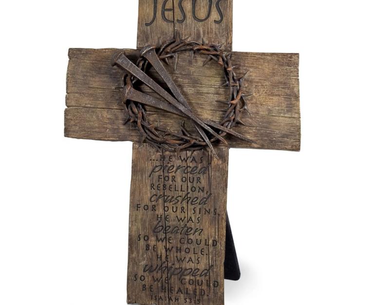 Features: easel back with wall-hanging option, look of wood, Power of the Cross booklet