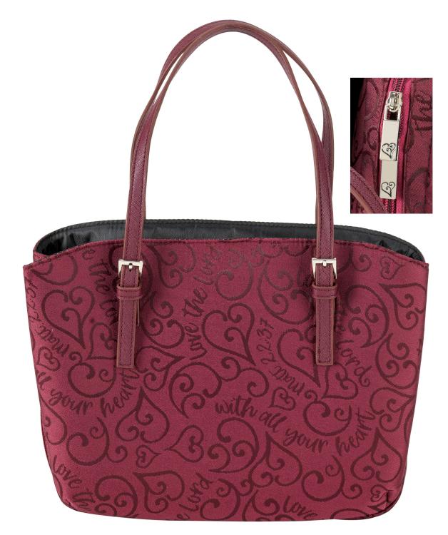 Wedge shaped burgundy cover with large outside pockets, Love the Lord with all your heart print with hearts design, Bookmark and elastic pen loop inside Size: 9 1/4 inches by 1 3/4 inches by 6 1/2 inches Height