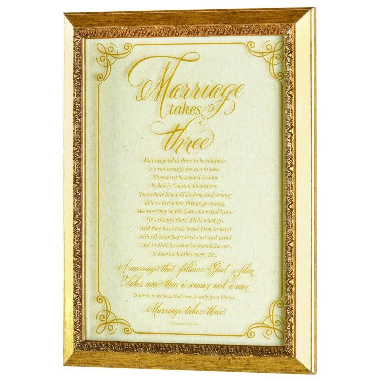The poem Marriage Takes Three is arranged in gorgeous calligraphy on this wall decor piece. It is on the underside of glass that is set about 3/8in above the background print for a stunning dimensional effect. The gold finish frame features an ornate inner lip. Print and glass size is 10 x 14; outer frame size is 12 x 16. Hanger on back. Words of poem: Marriage takes three to be complete; it is not enough for two to meet. They must be united in love by loves Creator, God above. Then their love will be firm and strong; able to last when things go wrong, Because they have felt Gods love and know He is always there, He will never go. And they have both loved Him in kind with all their heart and soul and mind And in that love they have found the way to love each other every day. A marriage that follows Gods plan Takes more than a woman and a man. It needs a oneness that can be only from Christ – Marriage takes three. Poem by B. Stuckwisch copyright Dicksons
