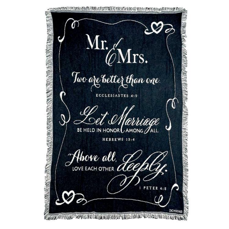 This elegant tapestry throw is an excellent wedding gift idea. Has words from three Bible verses that are related to Christian marriage: “”Two are better than one”” from Ecclesiastes 4:9, “”Let marriage be held in honor among all”” from Hebrews 13:4, and “”Above all, love each other deeply”” from 1 Peter 4:8. Made of 100% cotton, this medium weight throw measures 50″” x 70″” and is finished with a fringed edge.
