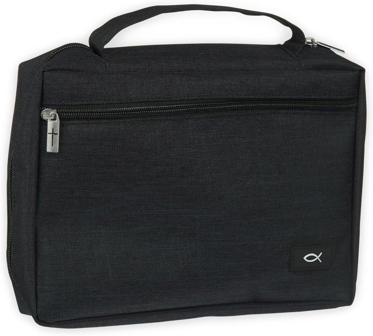 A zippered pocket on the front panel has a brushed silver metal zipper pull that is engraved with a cross design. To ensure the Bible opens all the way flat, the lay-flat black poly-canvas spine handle folds entirely away.
