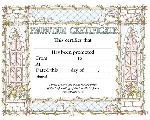 “A package of 36 flat certificates (8 1/2″ x 11″) for promotion printed in 4-color on heavy paper. This certificate is designed for children. Space for name, promoted from, promoted to, date, and a signature. The certificate features Philippians 3:14 (KJV) Scripture. A free online template for this certificate is available at www.bhpublishinggroup.com.”