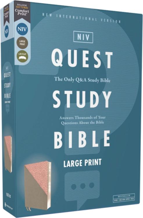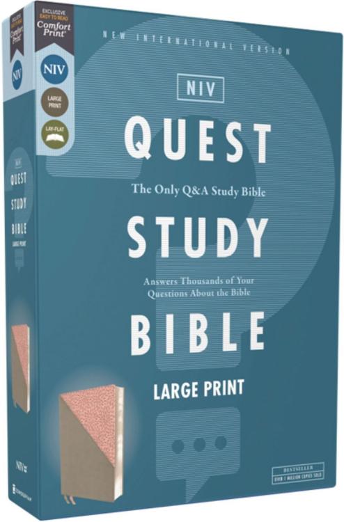 The NIV Quest Study Bible Answers Thousands of Your Questions About the Bible. One of the best ways to learn is to ask questions as you study. The NIV Quest Study Bible, Large Print guides you in that endeavor with thousands of questions you want answers for, including the top 100 most-asked questions about the Bible. It features over 7,000 notes written in an engaging question and answer format that give insight into the common, uncommon, and sometimes perplexing passages from the Bible.If you’ve ever read the Bible and found yourself asking, “Why did that happen?,” “What does this verse mean?,” or “How does this story impact my life today?,” then the NIV Quest Study Bible is the ideal resource. Dive in to discover that you’re not the only one with questions-and finally get the answers you’ve been looking for.The only question and answer Bible also features the exclusive Zondervan NIV Comfort Print(R) for smooth reading. Expertly designed specifically to be used for the New International Version (NIV) text, Comfort Print offers an easier reading experience that complements the most widely read modern-English Bible translation. The original Quest Study Bible was conceived in 1989 when two publishing companies, Zondervan and Christianity Today International, worked together to develop a Bible that would answer the challenging questions that arose as people read Scripture. Focus groups around the United States evaluated the usefulness of potential study Bible features and helped select the features that would be included in this Bible. Then, more than 1,000 people received passages of Scripture and were asked, “What questions do you have about this portion of the Bible?” Their responses helped determine what kinds of questions the notes would answer, helping to create a resource that answers the questions that real people have asked about the Bible. Now, with over one million copies sold, notes have been updated in subsequent releases to ensure that this Bible stays relevant and current to modern readers.Features:Complete text of the accurate, readable, and clear New International Version (NIV)Over 7,000 insightful notes arranged in a unique question and answer formatNearly 350 articles investigate the most asked questions about the BibleBook introductions that answer questions about each book, such as “Who wrote it?,” “Why?,” and “What should I look for?”Article index and expanded subject indexSingle-column Scripture text arranged in a modern, two-color p
